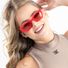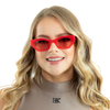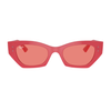 Gafas de sol modernas, una nueva forma cat-eye unisex , en material acetato color rojo translucido, lentes color rojo claro.